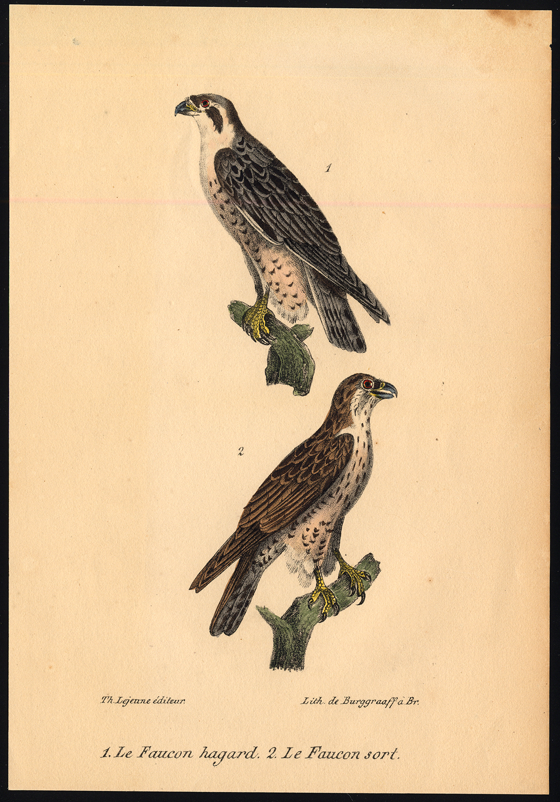Onderwerp: Plaat : ‘1. Le Faucon hagard – 2. Le Faucon soort.’ (1. Haggard Falcon – 2. Falcon-soorten).