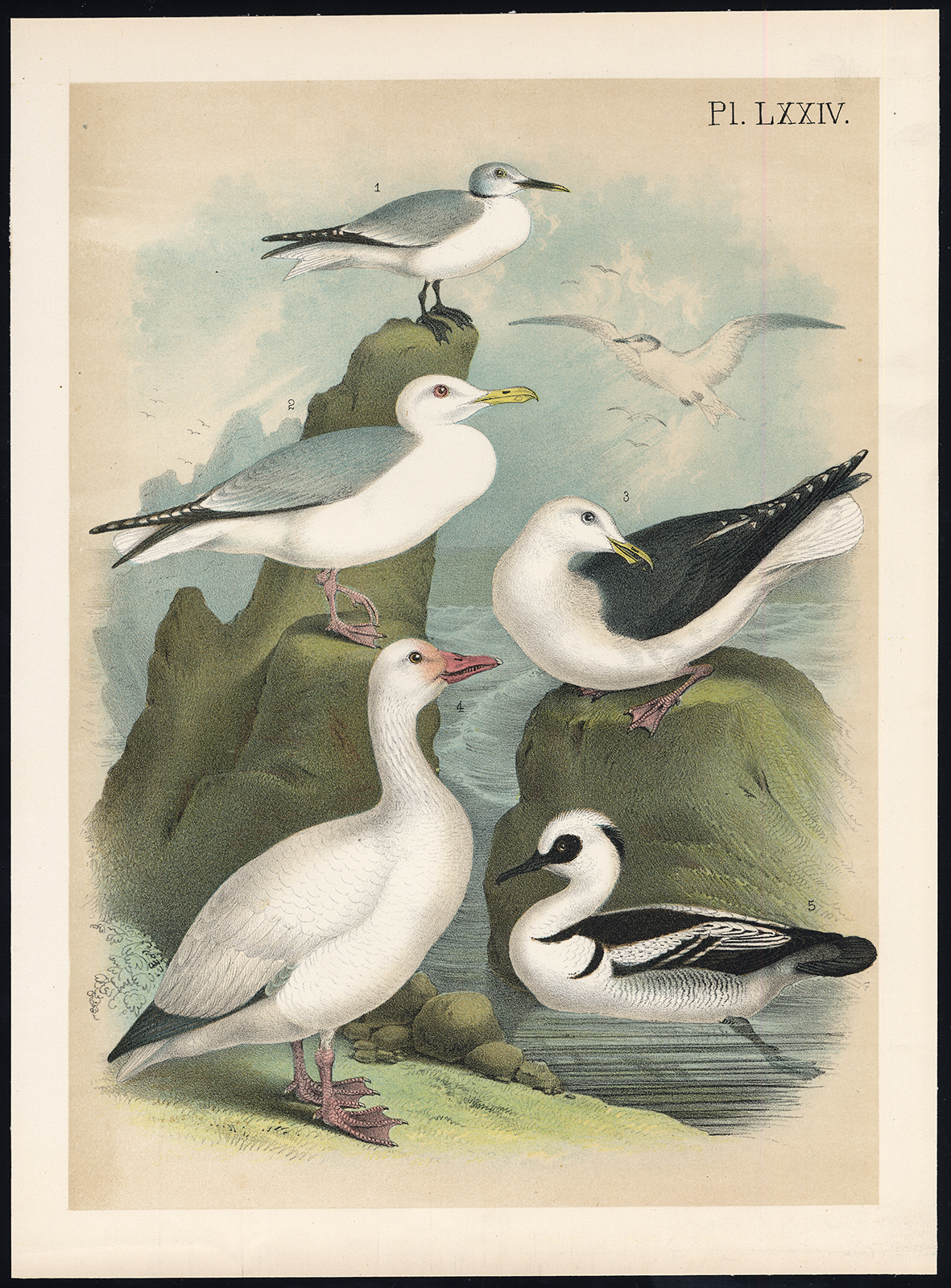 Onderwerp: Plaat LXXIV: Deze plaat toont vogelsoorten; 1. Vorkstaartmeeuw – 2. Westerse Meeuw, Gewone Meeuw, Zilvermeeuw – 3. Zadelrug, Grote Mantelmeeuw of Cobb – 4. Sneeuwgans, White Brandt – 5. Smew, White Non, White-headed of Dwerggansander.