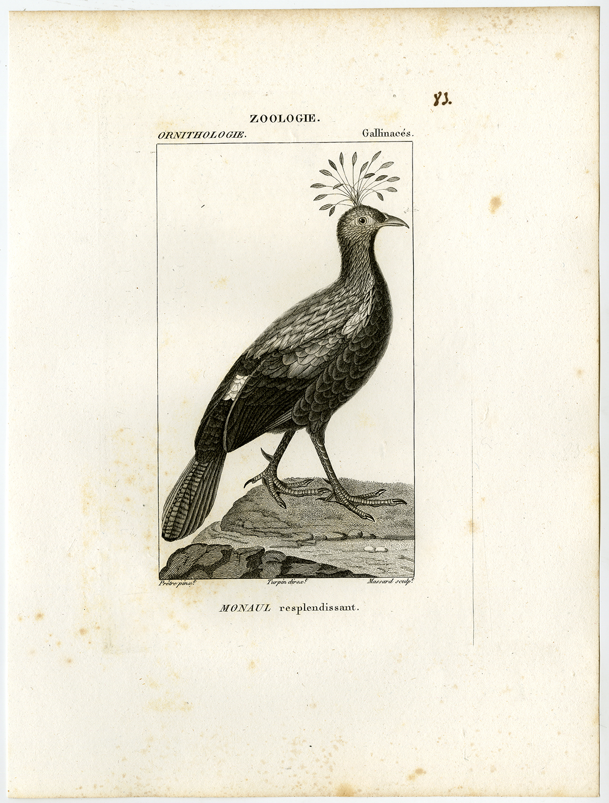 Onderwerp: Antieke prent, getiteld: ‘Pl. 83. Zoölogie, Ornithologie, Gallinaces. Monaul schitterend.’ – Deze plaat toont de Himalaya monal.