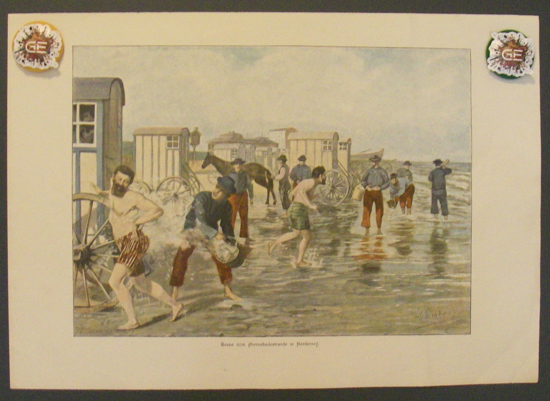 Houtgravure Norderney Strand Kleed wagens 1898 Paard Zee Badgasten