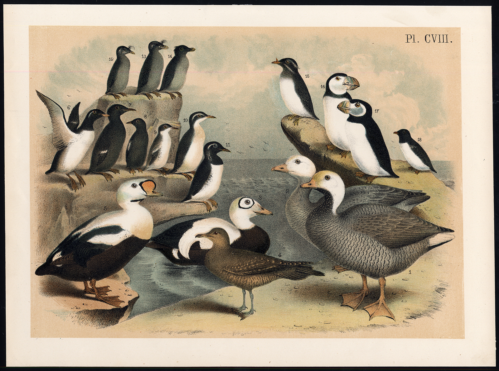 Onderwerp: Plaat CVIII: Deze plaat toont vogelsoorten; 1. Geschilderde Gans; Keizergans – 2. Blauwe gans – 3. Gebrilde eider – 4. Parasitaire, of Richardson’s Jaeger – 5. Koning Eider, of Eend – 6. Dikbek of Brunnich’s Zeekoet – 7. Roetige Zeekoet – 8. Duif Zeekoet – 9 Kittlitz’s Zeekoet, of Murrelet – 10. Temminck’s Zeekoet – 11. Zwartkeelzeekoet – 12. Witkeelalk – 13. Kuifalk – 14. Papegaai, of Parroquet Alk – 15. Hoornsnavelalk – 16. Kleine Alk; Zeeduif, of Dovekie, grootsnavelduiker – 17. Gehoornde papegaaiduiker.