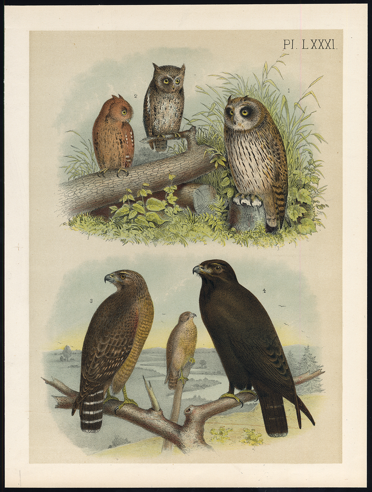 Onderwerp: Plaat LXXXI: Deze plaat toont vogelsoorten; 1. Uil met korte oren – 2. Gevlekte uil, rode uil of krijsuil – 3. Roodschouderbuizerd of buizerd – 4. Zwarte ruwpootbuizerd of buizerd.
