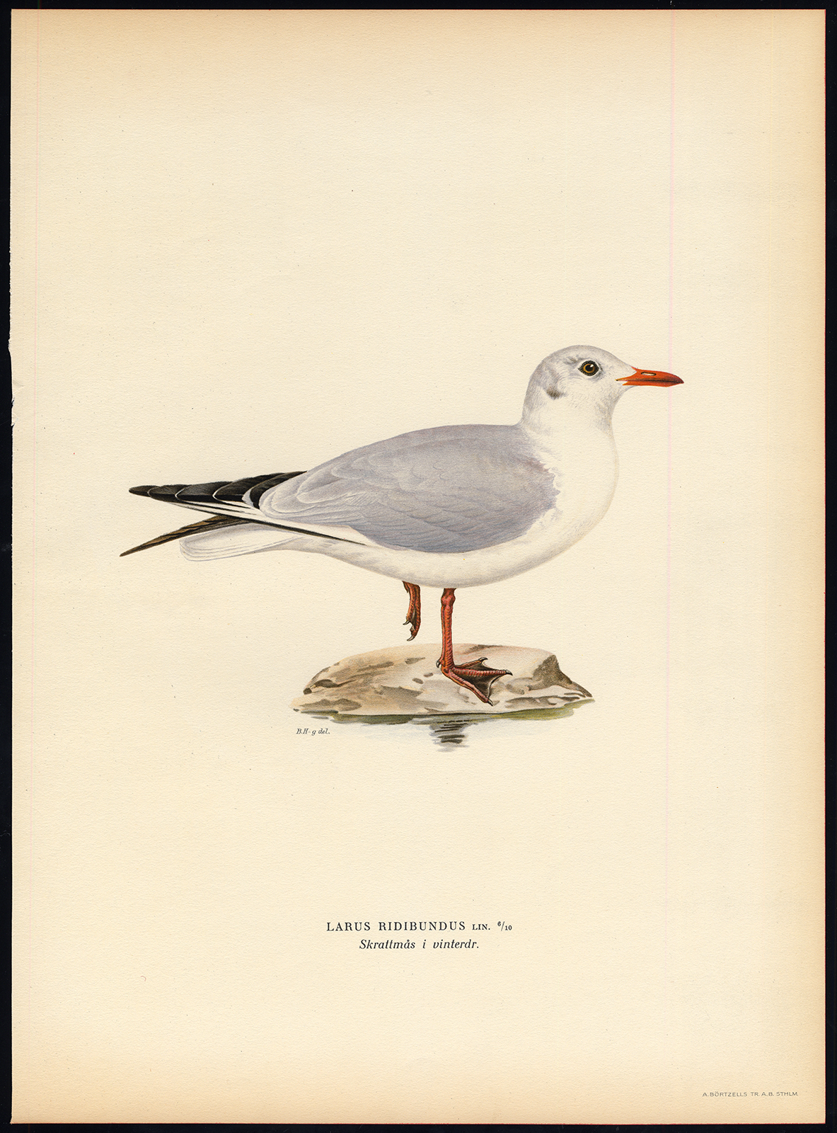 Onderwerp: Plaat : ‘Larus ridibundus Lin.’ (Chroicocephalus ridibundus – Kokmeeuw, winterkleed).