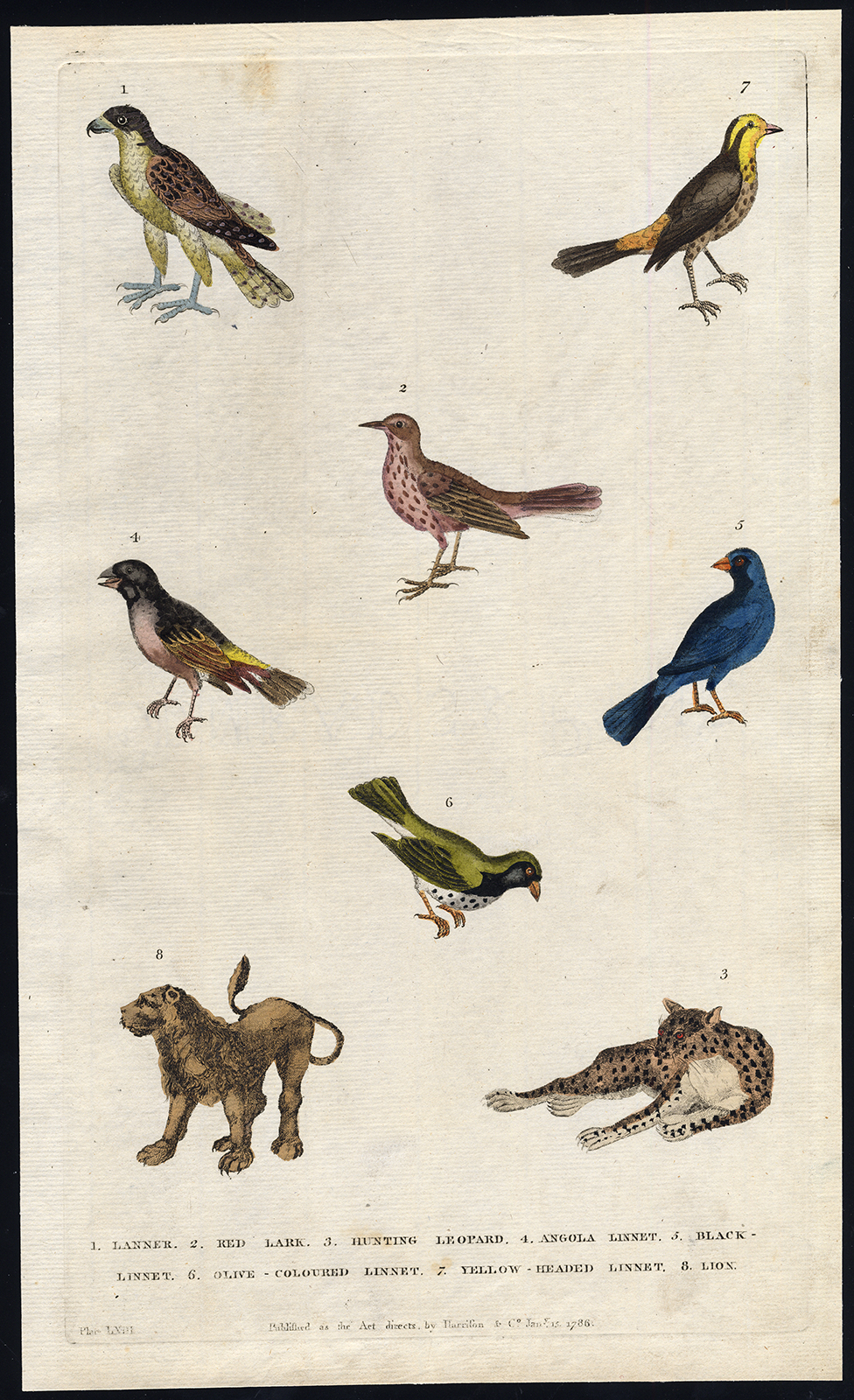 Onderwerp: Plaat LXIII: Deze plaat toont verschillende diersoorten; 1. Lanner – 2. Rode leeuwerik – 3. Jagende luipaard (cheetah) – 4. Angola kneu – 5. Zwarte kneu – 6. Olijfkleurige kneu – 7. Geelkop kneu – 8. Leeuw.