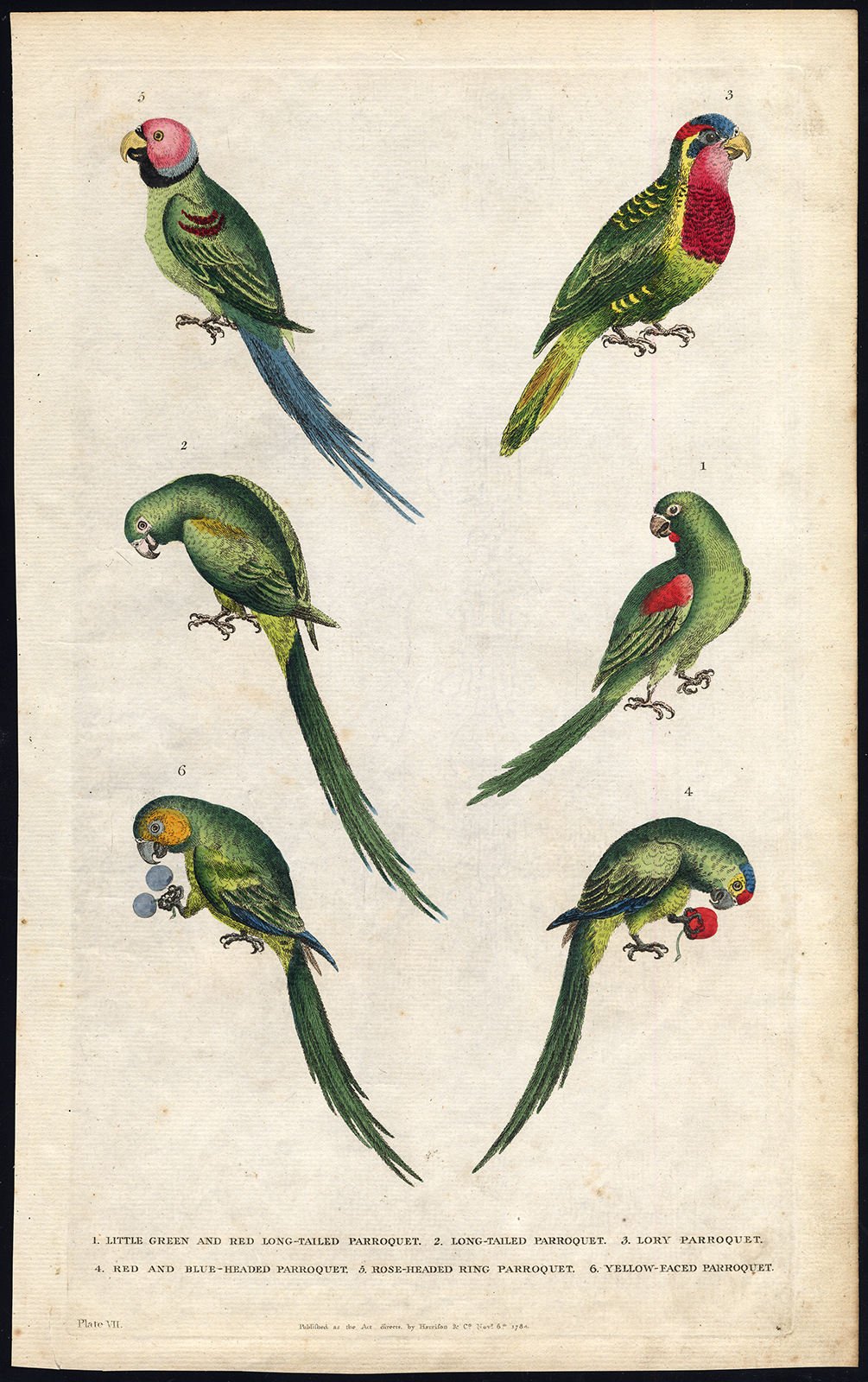 Onderwerp: Plaat VII: Deze plaat toont verschillende vogelsoorten; 1. Kleine Groene en Rode Langstaartparkiet – 2. Langstaartparkiet – 3. Lory Parroquet – 4. Rood en Blauwkopparkiet – 5. Rozenkopringparkiet – 6. Geelkopparkiet.