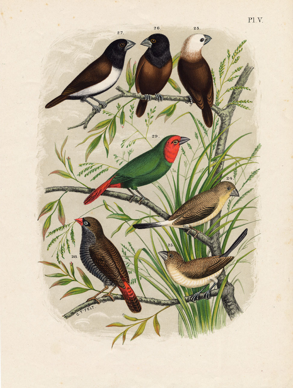 Onderwerp: Plaat V: 25. ‘Whitkop Nonnette – Pop Maja (Maja Finch.); 26. Zwartkop Nonnetje – Lonchura malacca atricapilla (Zwartkopvink.); 27. Driekleur nonnetje – Malakka Malakka (Driekleurige non.); 28. Vuurstaartamadine – Prachtig embleem (Mooie vuurstaart.).