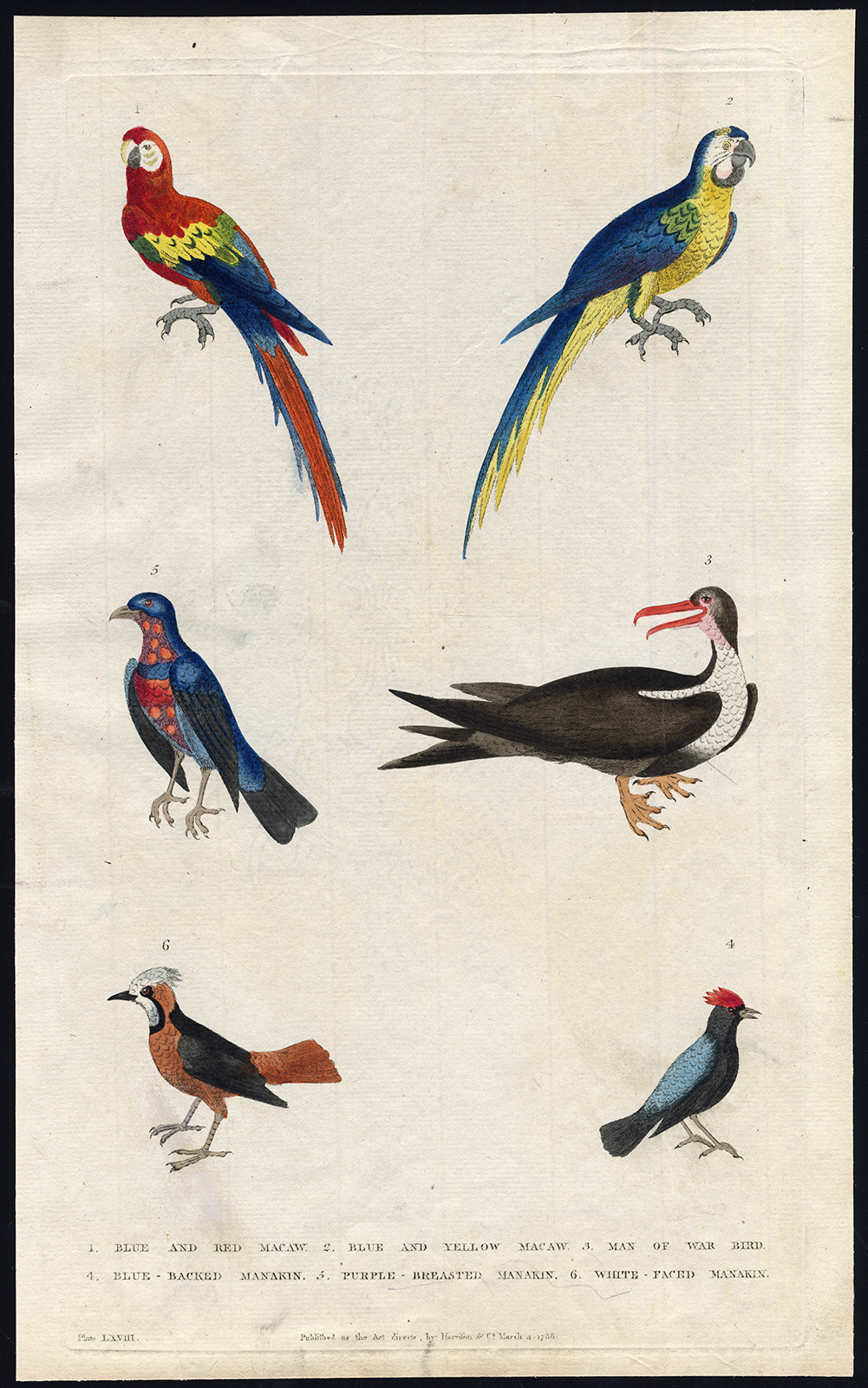 Onderwerp: Plaat LXVIII: Deze plaat toont verschillende vogelsoorten; 1. Blauwe en rode ara – 2. Blauwe en gele ara – 3. Man of War Bird – 4. Blue-backed Manakin – 5. Purple-breasted Manakin – 6. White-faced Manakin.