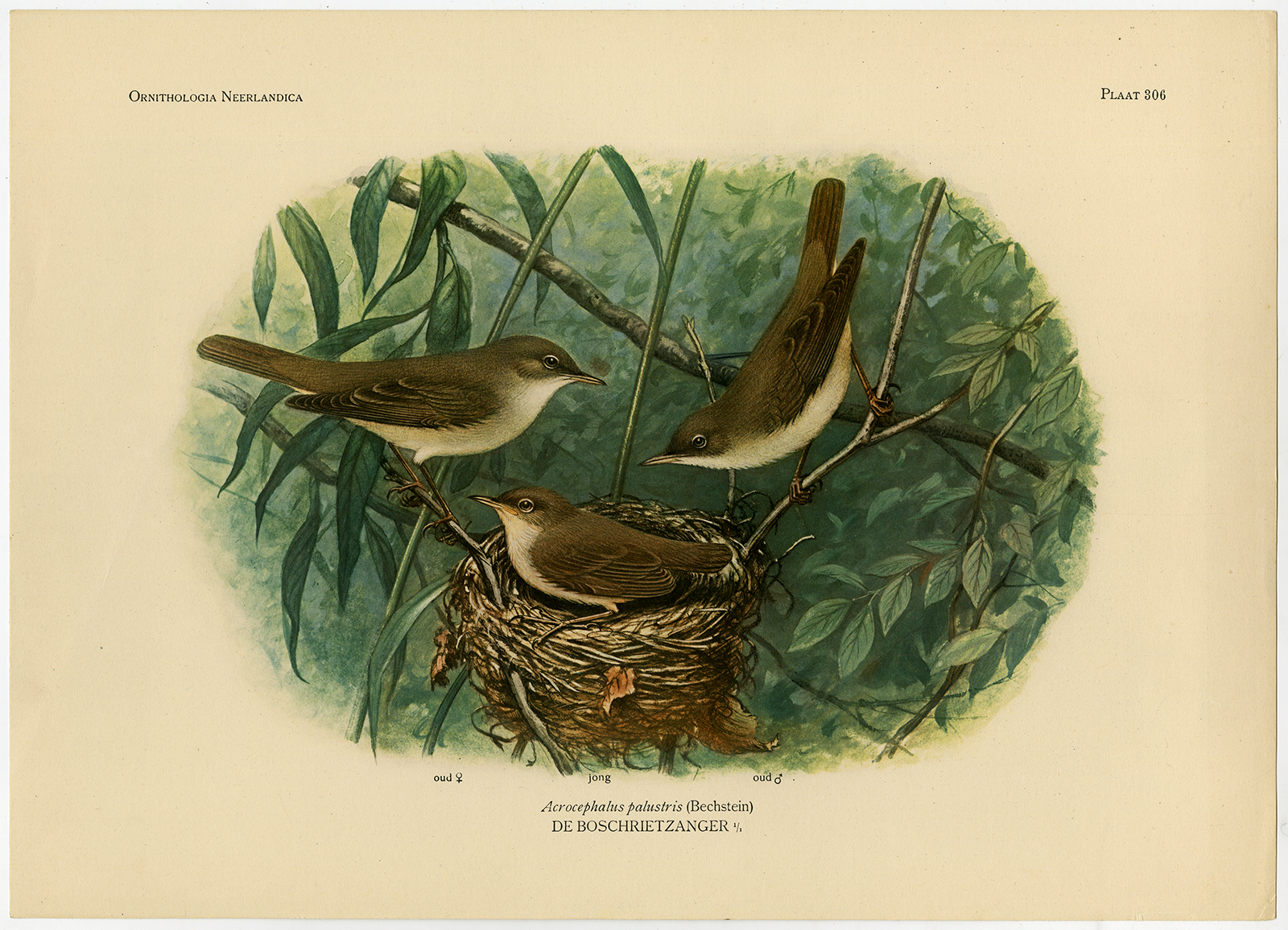 Onderwerp: Antieke prent, getiteld: ‘Pl. 306. Ornithologica Neerlandica. Acrocephalus palustris – De Boschrietzanger’ – Dit bord toont de moeraszanger, mannetje en vrouwtje.