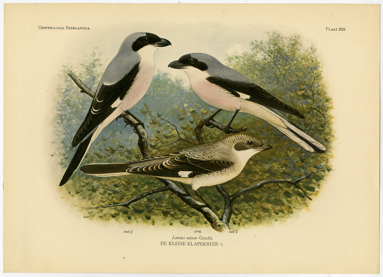 Onderwerp: Antieke prent, getiteld: ‘Pl. 336. Ornithologica Neerlandica. Lanius minor Gmelin – De Kleine Klapekster’ – Dit bord toont de kleine klauwier, mannetje en vrouwtje.