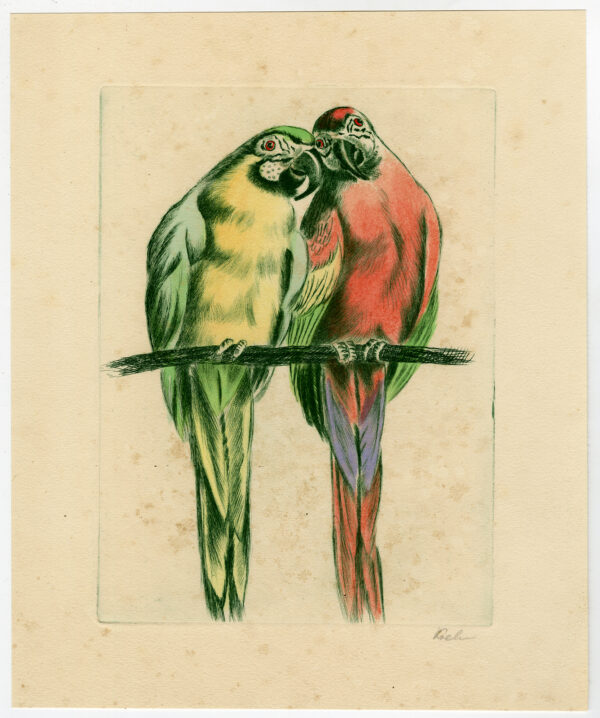 Onderwerp: Antieke druk, zonder titel. Deze originele antieke print toont papegaaien. Gesigneerd door de kunstenaar.