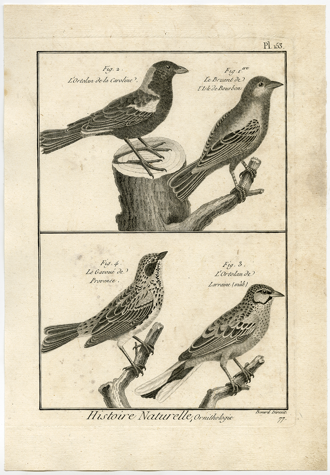 Onderwerp: Antieke prent, getiteld: ‘Pl. 153. Histoire Naturelle, Ornithologie Fig. 1. Le Bruant de l’isle de Bourbon – 2. L’Ortolan de la Caroline – 3. L’Ortolan de Lorraine – 4. Le Gavoue de Provence.’ – Dit bord toont verschillende vogelsoorten; ortolaan enz.