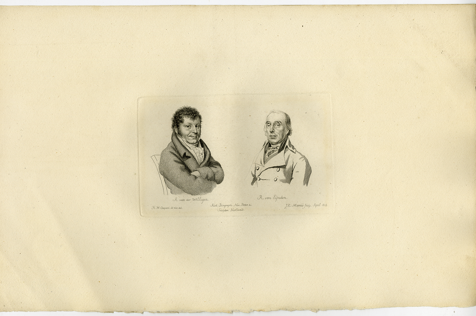 Onderwerp: Antieke druk, zonder titel. Portretten van A. van der Willigen en R. van Eijnden. Adriaan van der Willigen (1766-1841) was historicus, kunstverzamelaar en rentmeester van Tilburg. Roeland van Eijnden (1747-1819) was kunsthistoricus en amateur-(portret)schilder en tekenaar.
