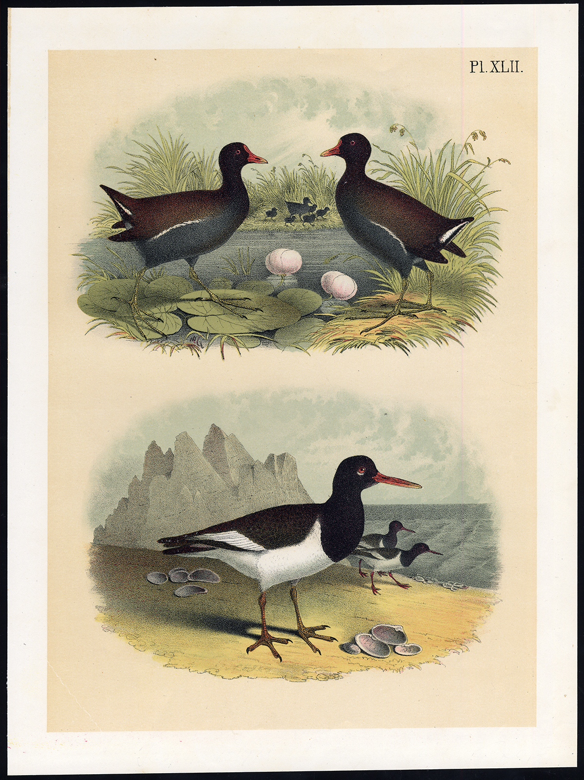 Onderwerp: Plaat XLII: Deze plaat toont vogelsoorten; 1. Gewone of Florida Gallinule, 2. Scholekster.