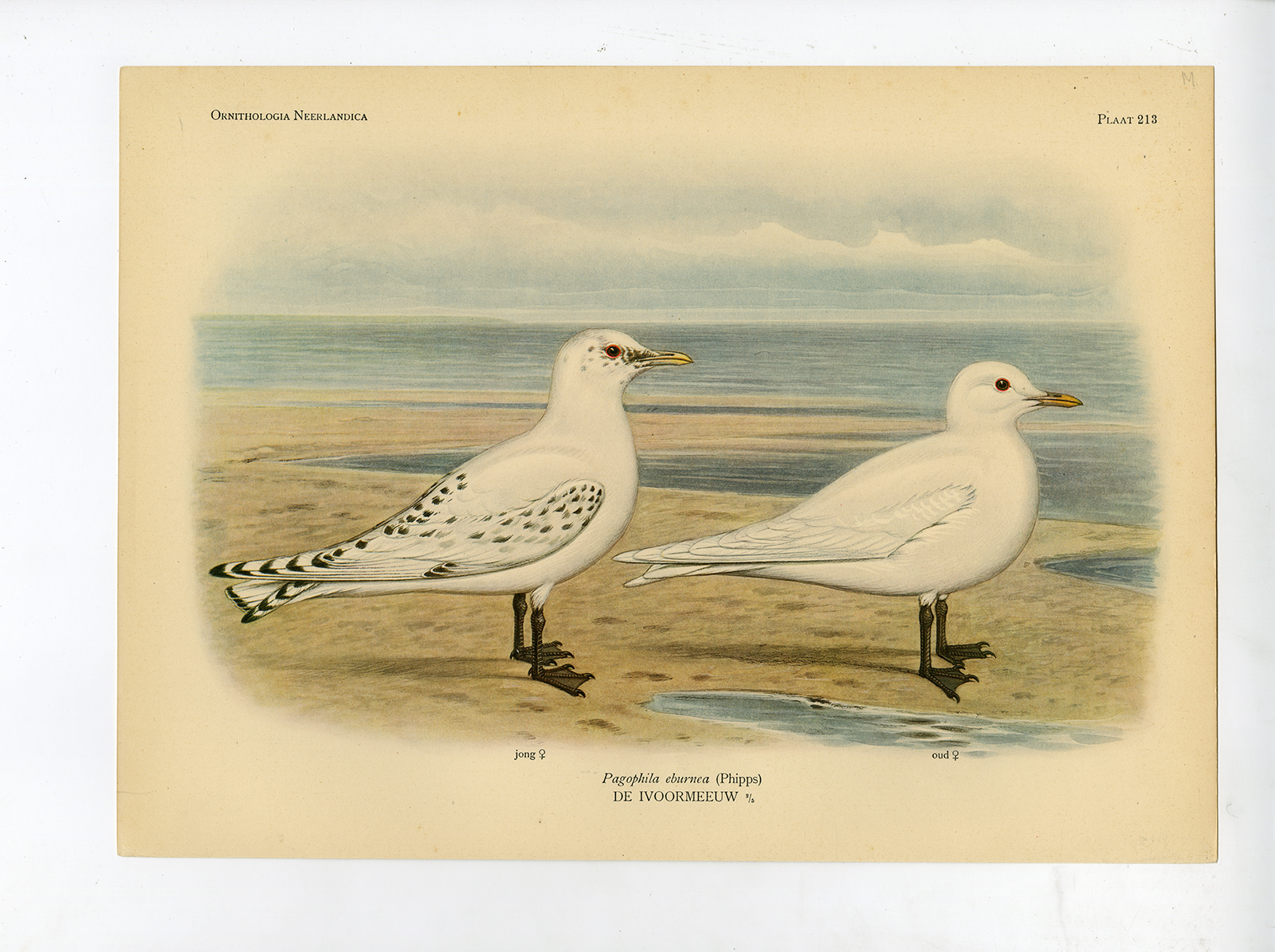 Onderwerp: Antieke prent, getiteld: ‘Pl. 213. Ornithologica Neerlandica. Pagophila eburnea – De Ivoormeeuw’ – Dit bord toont de ivoren meeuw (Pagophila eburnea).