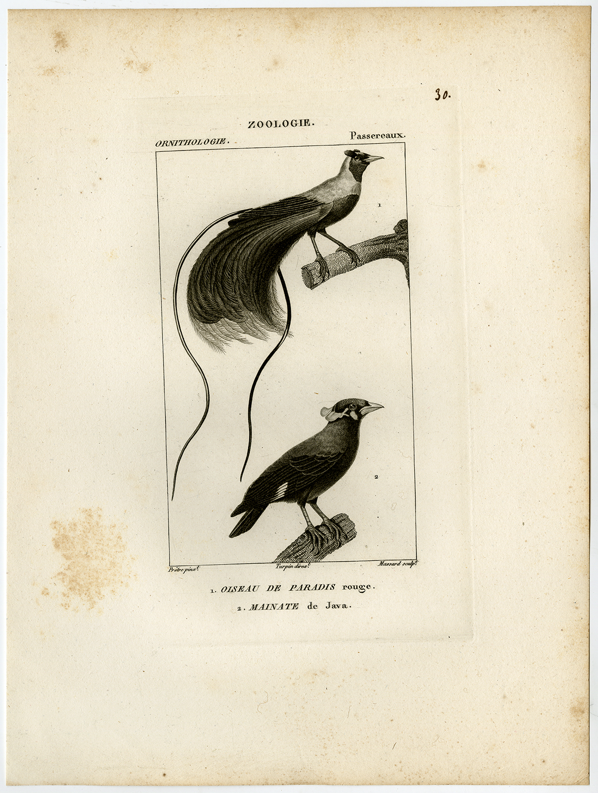 Onderwerp: Antieke prent, getiteld: ‘Pl. 30. Zoölogie, Ornithologie, Passereaux. 1. Oiseau de Paradis rouge – 2. Mainate de Java.’ – Dit bord toont vogelsoorten; paradijsvogel en de myna.