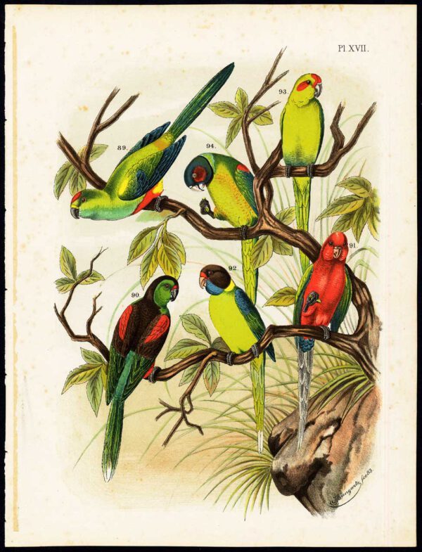 Onderwerp: Plaat XVII: 89. Van Geelband Parrakeet – Veelkleurige Psittacus (Veelkleurige parkiet.); 90. Het paradijspark – Psittacus pulcherrimus (prachtige papegaai.); 91. The King’s Parrot – Psittacus cyanopygus (Koning Parrakeet, Scarlet en Green Parrot.); 92. Het nekbandpark – Psittacus semitorquatus (Geelkraagparkiet.); 93. Nieuw-Zeeland Park – Psit. Zelandiae (Nieuw-Zeelandse parkiet.); 94. De Edelparkiet met Blauwenkop – Psittacus cyanocephalus (Pruimkopparkiet, Blauwkopparkiet).