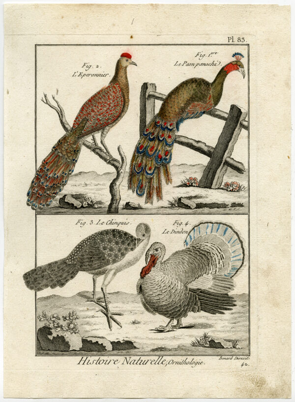 Onderwerp: Antieke prent, getiteld: ‘Pl. 83. Histoire Naturelle, Ornithologie Afb. 1. Le Paon panache – 2. L’Eperonnier – 3. Le Chinquis – 4. Le Dindon.’ – Op deze plaat staan verschillende soorten hoenders afgebeeld; pauw, pauw, grijze pauwfazant, kalkoen, enz.
