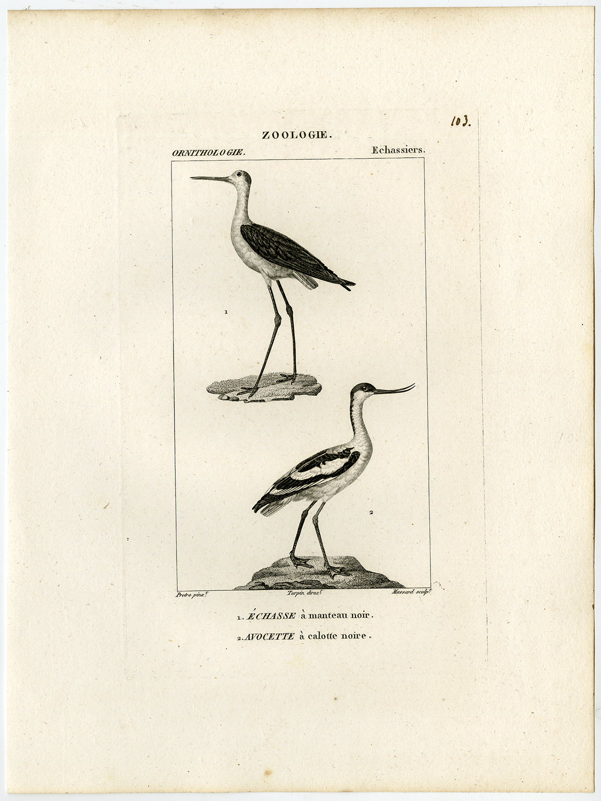 Onderwerp: Antieke prent, getiteld: ‘Pl. 103. Zoölogie, Ornithologie, Echassiers. 1. Echasse a manteau noir – 2. Avocette a calotte noir.’ – Dit bord toont vogelsoorten; steltloper, steltloper of bonte steltloper en bonte kluut.