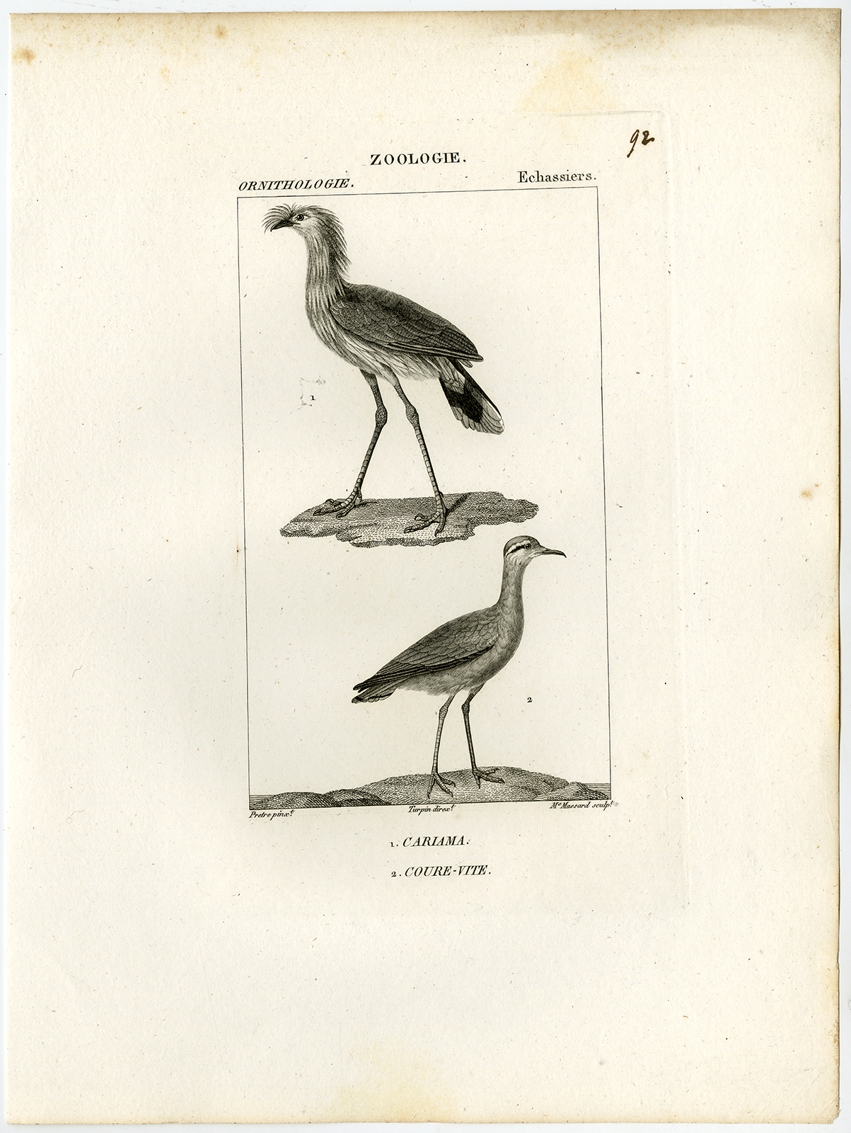 Onderwerp: Antieke prent, getiteld: ‘Pl. 92. Zoölogie, Ornithologie, Echassiers. 1. Cariama – 2. Couré-vite.’ – Dit bord toont vogelsoorten; roodpotige seriema of kuifcariama en crèmekleurige courser.