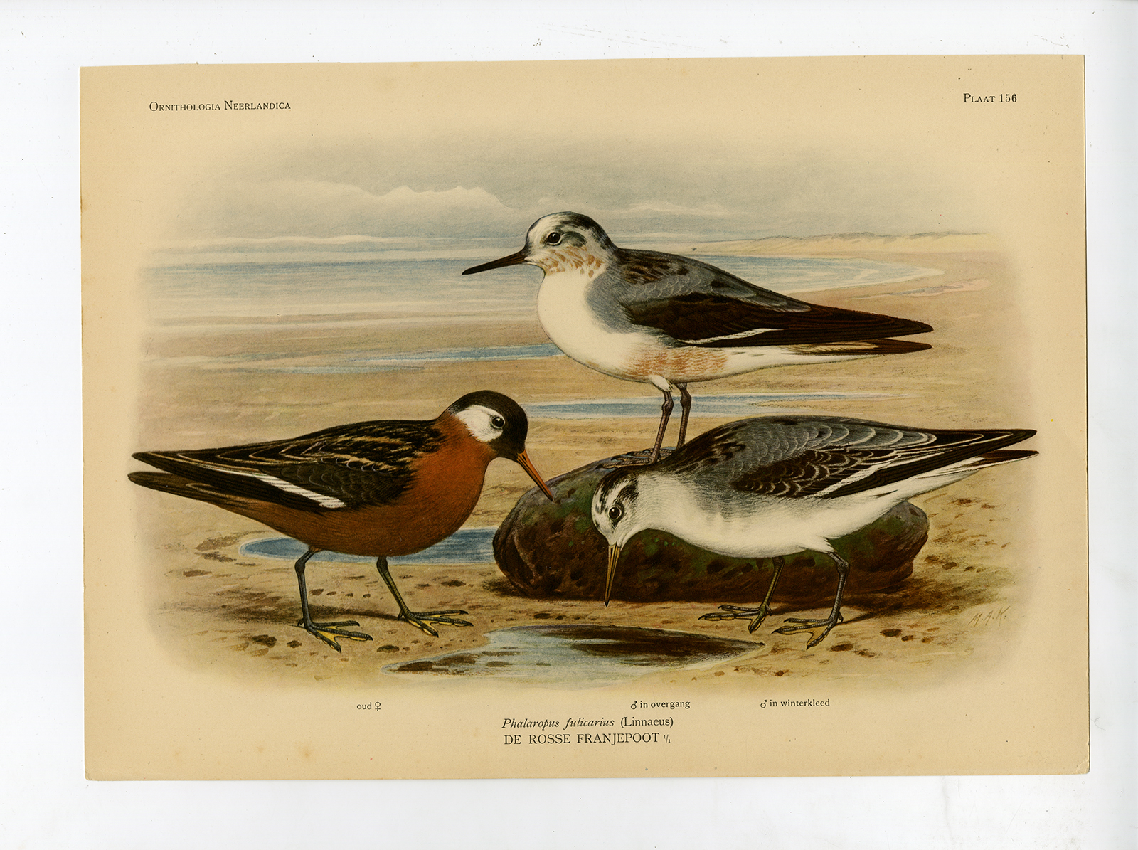 Onderwerp: Antieke prent, getiteld: ‘Pl. 156. Ornithologica Neerlandica. Phalaropus fulicarius – De Rosse Franjepoot’ – Deze plaat toont de rode franjepoot (in Europa grijze franjepoot genoemd), Phalaropus fulicarius, mannelijk en vrouwelijk.