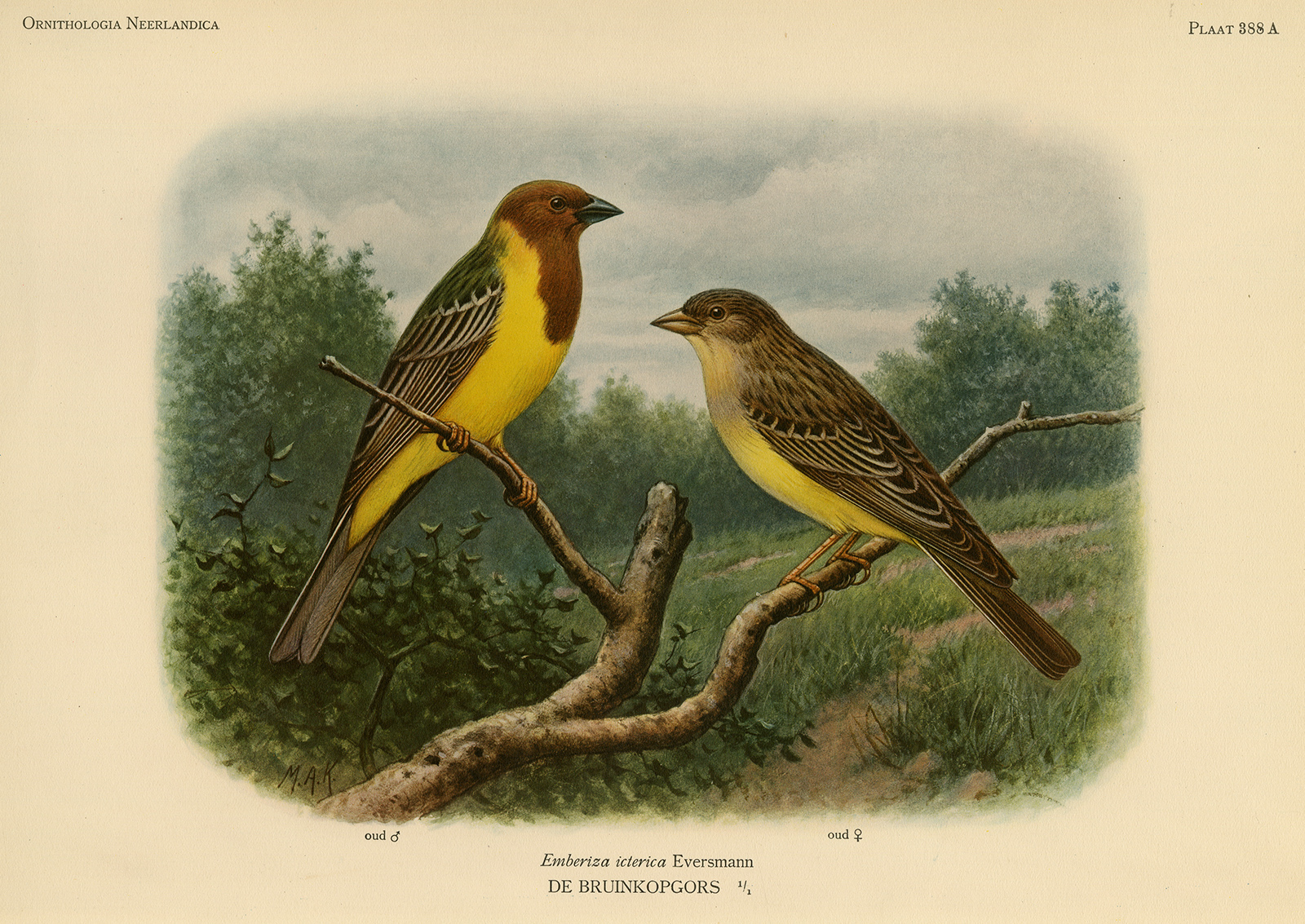 Onderwerp: Antieke prent, getiteld: ‘Pl. 388A. Ornithologica Neerlandica. Emberiza icterica Eversmann – De Bruinkopgors’ – Dit bord toont de roodharige gors, mannetje en vrouwtje.
