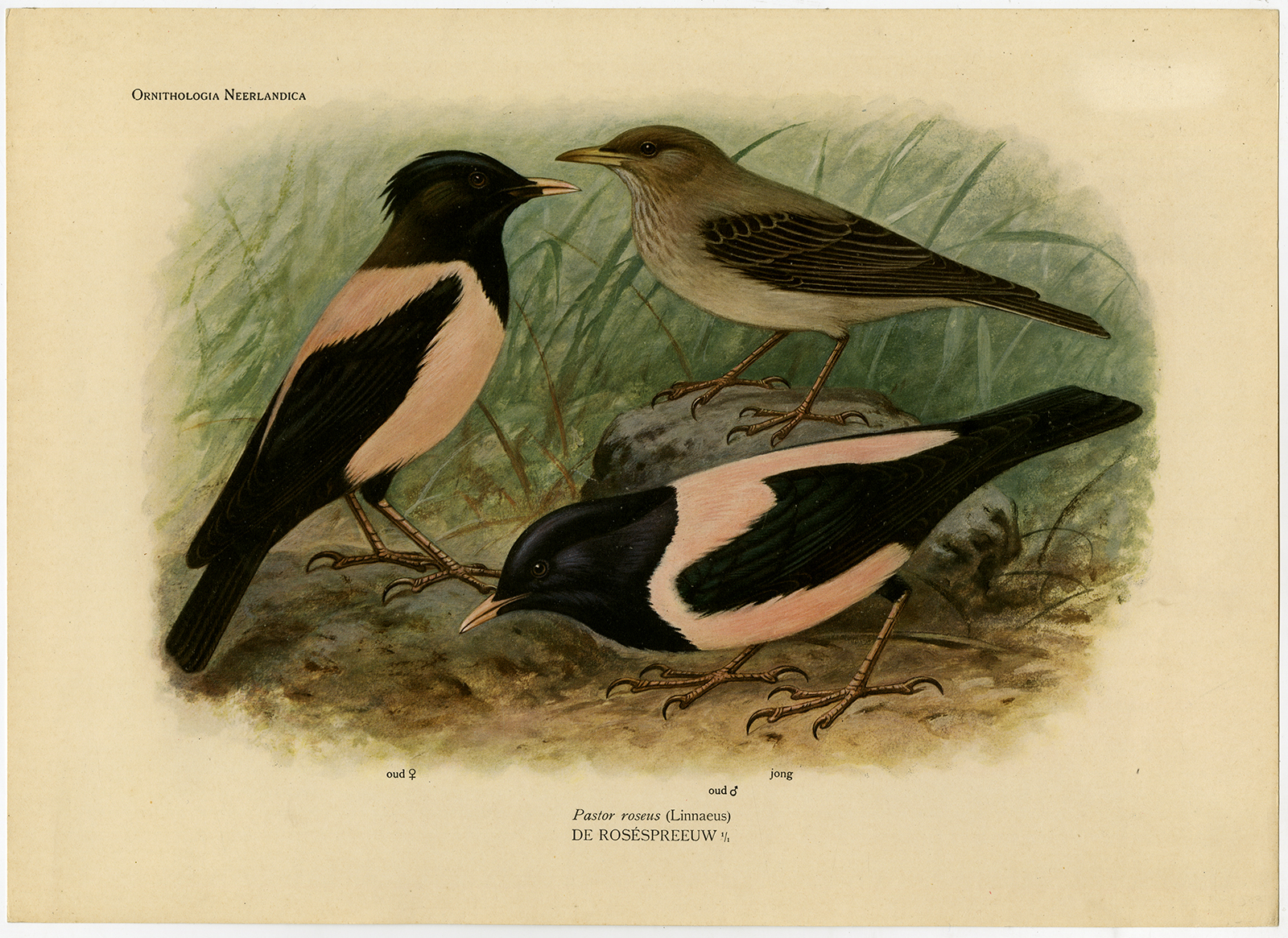 Onderwerp: Antieke prent, getiteld: ‘Pl. 313. Ornithologica Neerlandica. Pastor roseus Linnaeus – De Rosespreeuw’ – Dit bord toont de roze spreeuw, mannelijk en vrouwelijk.