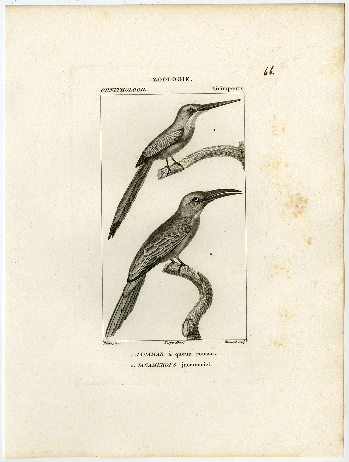 Onderwerp: Antieke prent, getiteld: ‘Pl. 66. Zoölogie, ornithologie, Grimpeurs. 1. Jamacar a queue rousse – 2. Jacamerops jacamarici.’ – Dit bord toont vogelsoorten; roodstaartjacamar en grote jacamar.