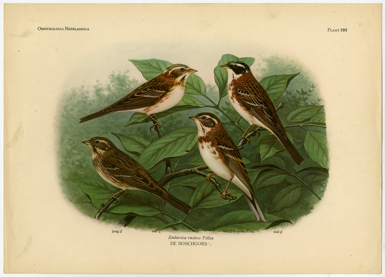 Onderwerp: Antieke prent, getiteld: ‘Pl. 393. Ornithologica Neerlandica. Emberiza rustica Pallas – De Boschgors’ – Dit bord toont de rustieke gors, mannelijk en vrouwelijk.