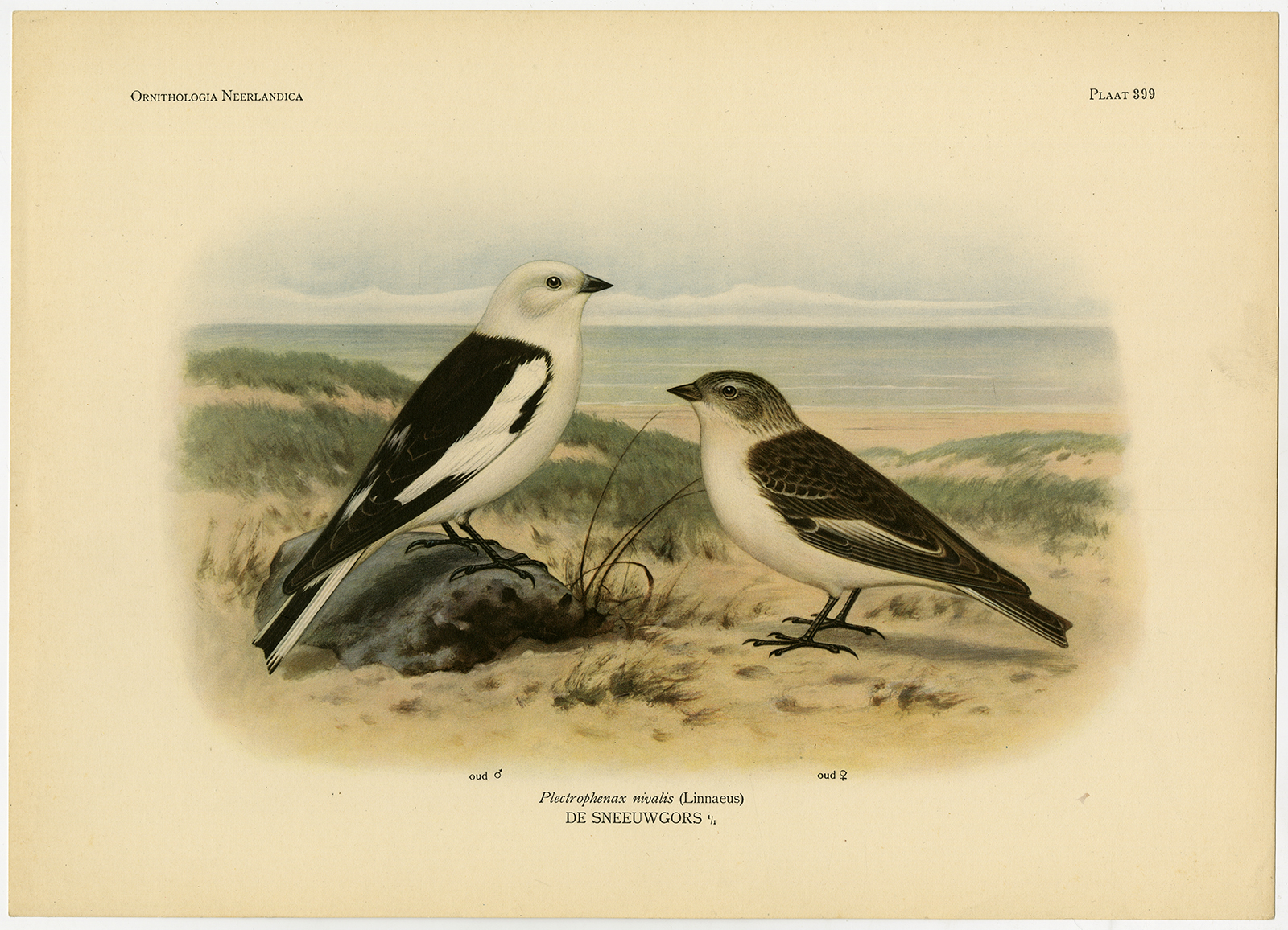 Onderwerp: Antieke prent, getiteld: ‘Pl. 399. Ornithologica Neerlandica. Plectrophenax nivalis – De Sneeuwgors’ – Deze plaat toont de sneeuwgors, mannelijk en vrouwelijk.