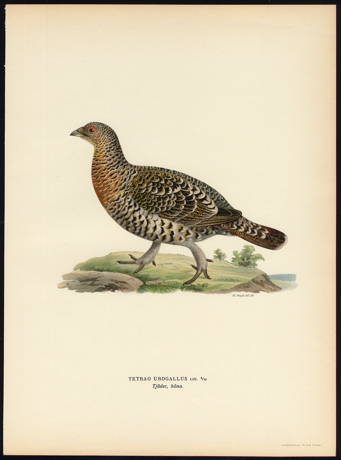 Onderwerp: Bord : ‘Tetrao urogallus Lin.’ (Oude auerhoen, boshoen, heide haan, vrouwtje).