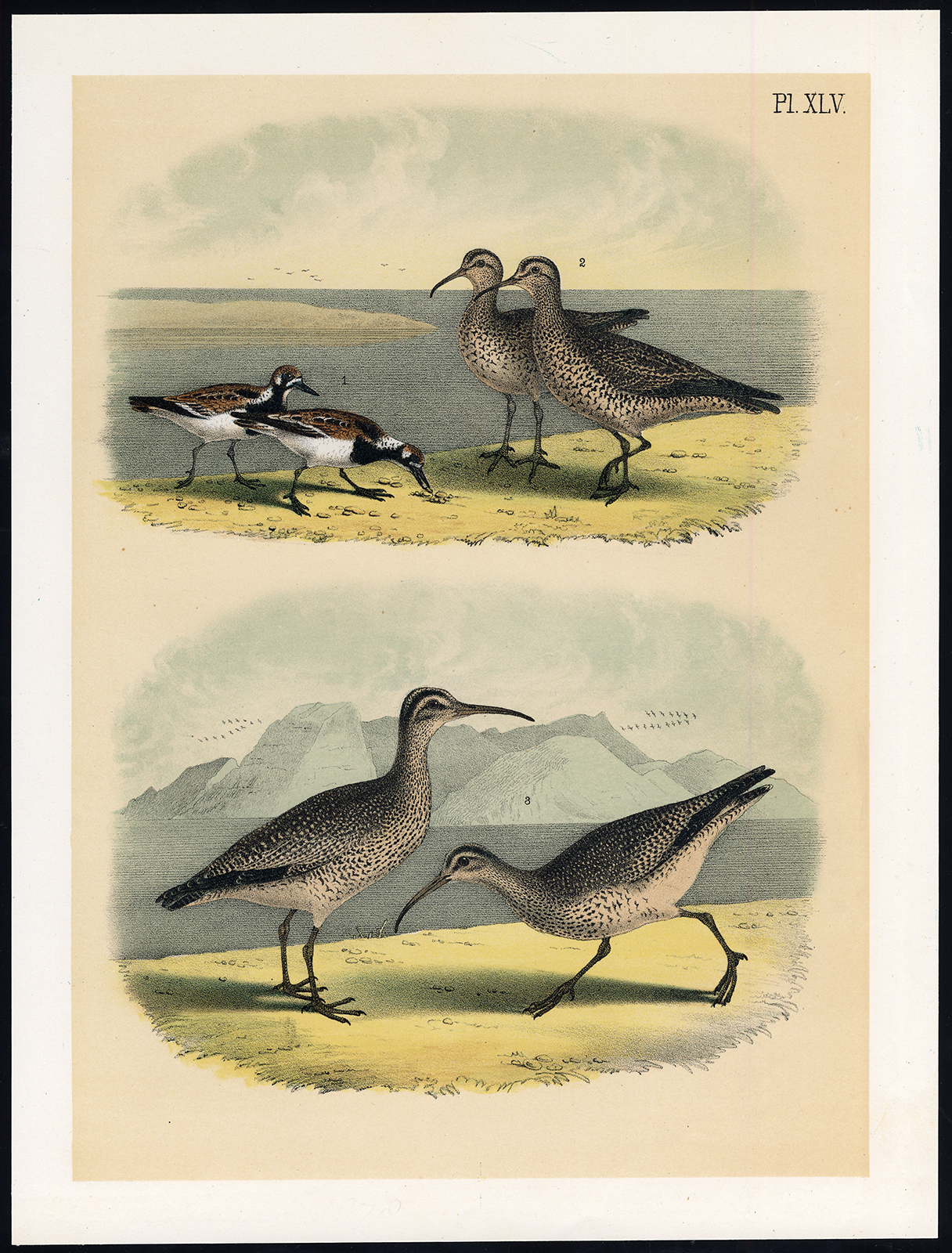 Onderwerp: Bord XLV: Dit bord toont vogelsoorten; 1. Turnstone – 2. Esquimaux Wulp, of Dough-Bird 3. Hudsonian Wulp.