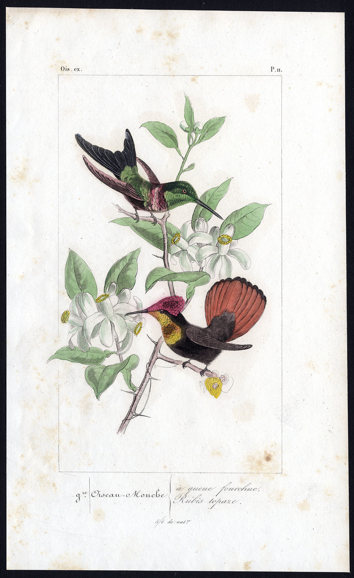 Onderwerp: Origineel bord van een duur werk, getiteld: Gre Oiseau-Mouche – a queue fourchue / Rubis topaze (Moschilus surcatus & Trochilus moschilus / Smal Fork-Tailed Hummingbird & Ruby-necked Hummingbird).