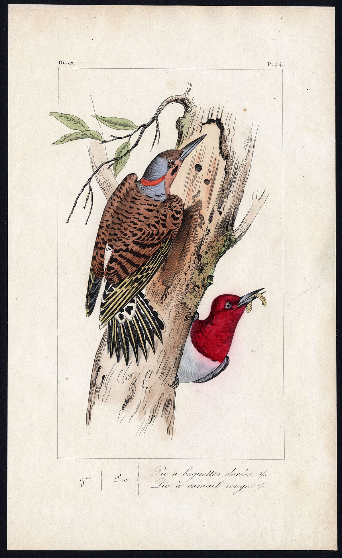 Onderwerp: Origineel bord van een duur werk, getiteld: Gre. Pic – Pic a baguettes dorees / Pic a camail rouge (Picus auratus & Picus erytrocephalus / Gold-winged Woodpecker & Red-headed Woodpecker).