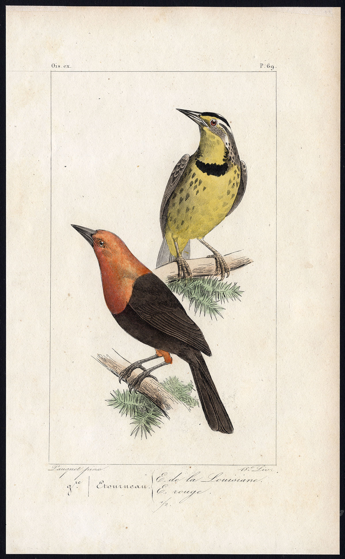 Onderwerp: Origineel bord van een duur werk, getiteld: Gre. Etourneau – E. de la Louisiane / E. rouge (Sturnus Ludovicianus & Sturnus ruber / Weideleeuwerik & een spreeuwsoort).