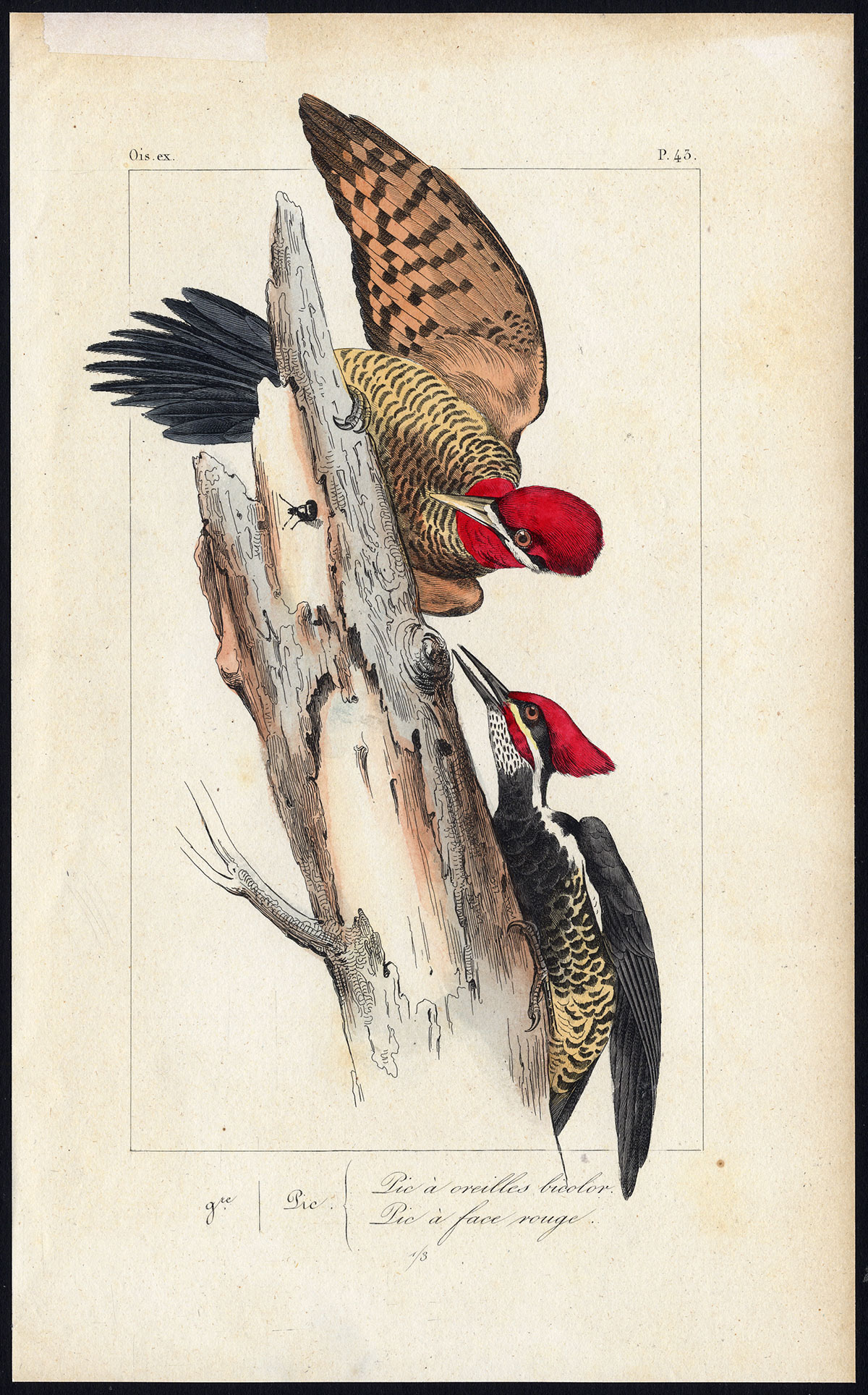 Onderwerp: Origineel bord van een duur werk, getiteld: Gre. Pic – Pic a oreilles bicolor / Pic a face rouge (Picus robustus & Picus erythrops / Robuuste specht & Lineated Woodpecker).