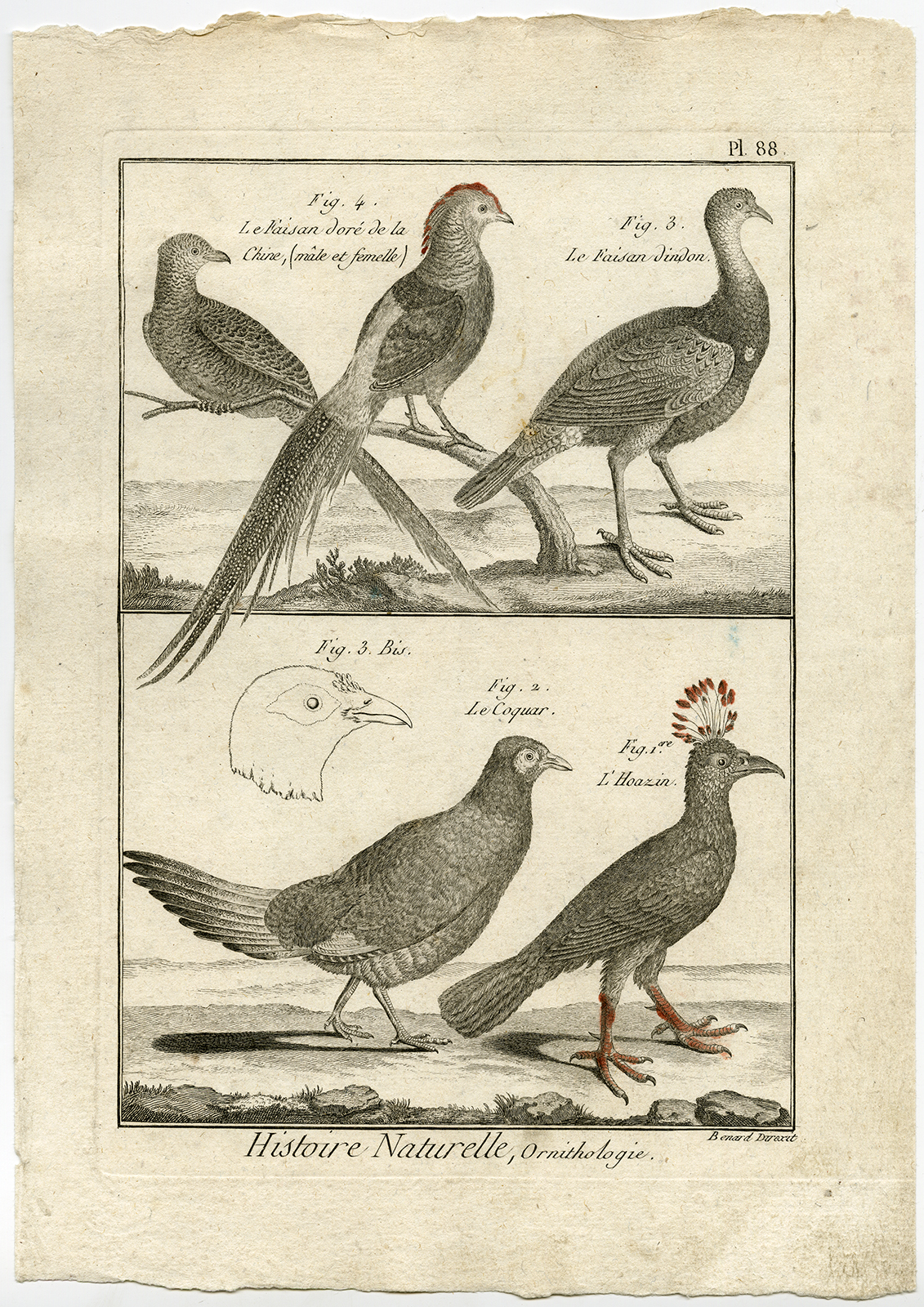 Onderwerp: Antieke prent, getiteld: ‘Pl. 88. Histoire Naturelle, Ornithologie Fig. 1. L’Hoazin – 2. Le Coquar – 3. Le Faisan dindon – 4. Le Faisan dore de la Chine.’ – Dit bord toont verschillende vogelsoorten; goudfazant, hoatzin enz.