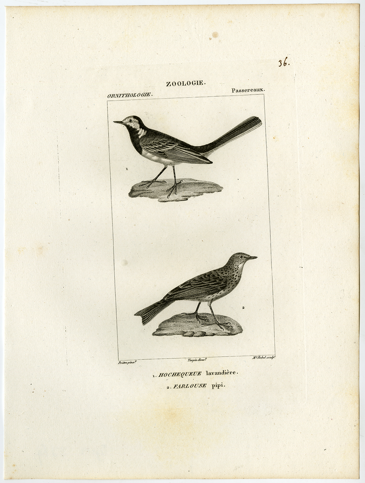 Onderwerp: Antieke prent, getiteld: ‘Pl. 36. Zoölogie, Ornithologie, Passereaux. 1. Hochequeue lavandiere – 2. Farlouse pipi.’ – Dit bord toont vogelsoorten; witte kwikstaart en weidepieper.