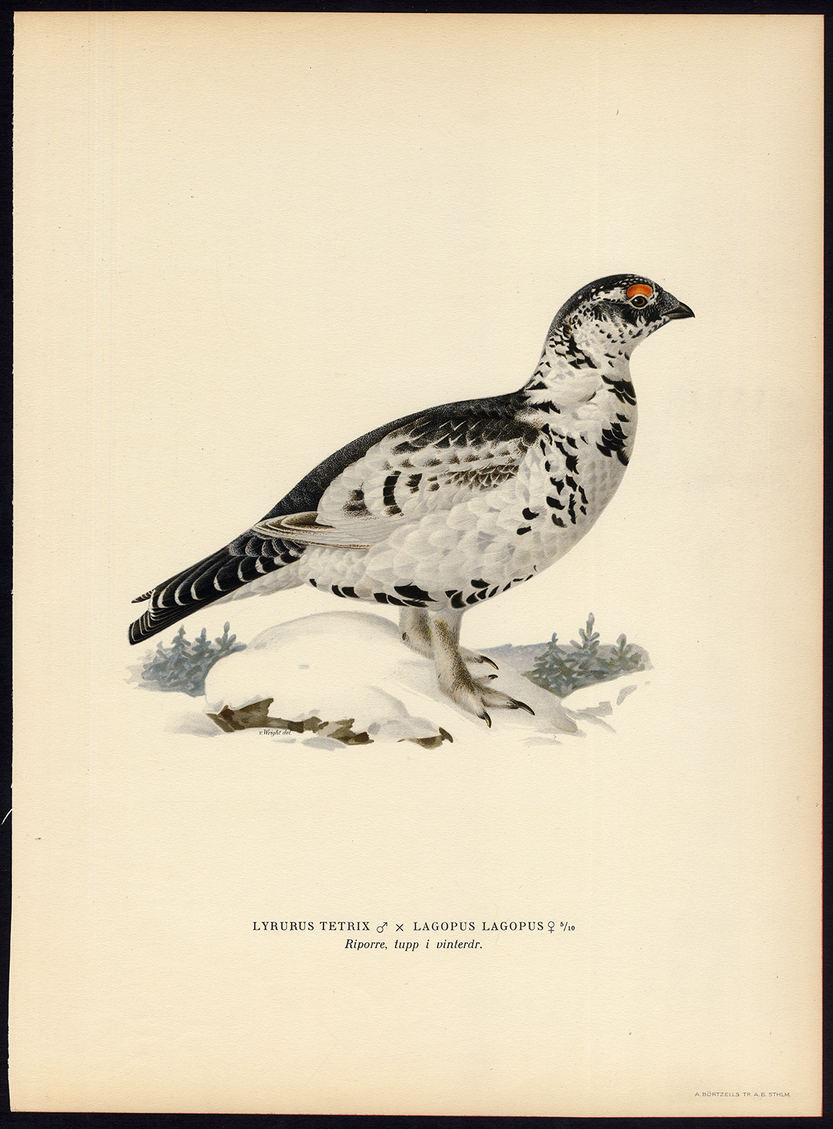 Onderwerp: Bord : ‘Lyrurus tetrix Lin x Lagopus lagopus.’ (Kruis tussen Tetrao tetrix – korhoen, mannetje en Lagopus lagopus – wilgenschildhoen, vrouwtje).