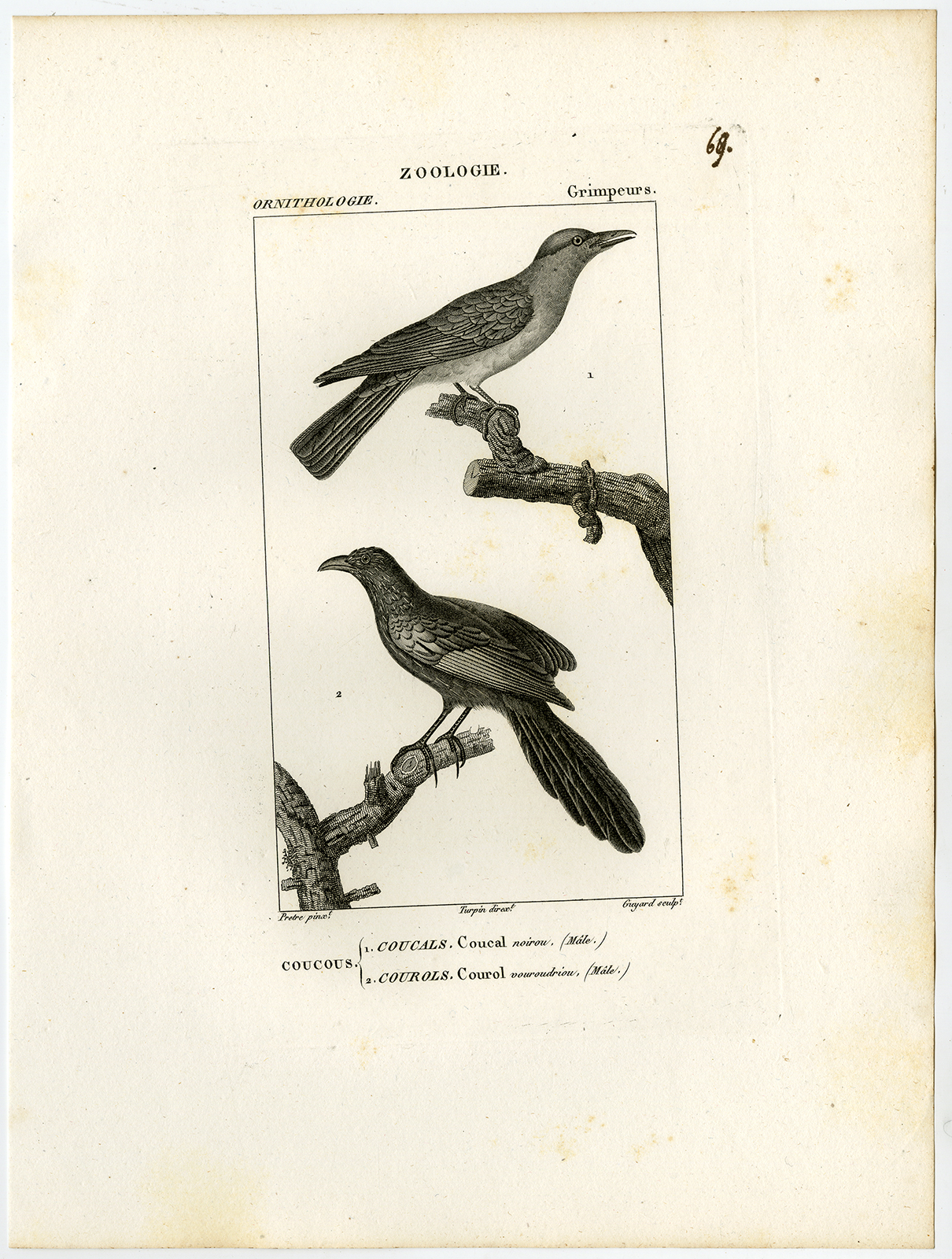 Onderwerp: Antieke prent, getiteld: ‘Pl. 69. Zoölogie, ornithologie, Grimpeurs. 1. Coucal noirou – 2. Courol vouroudriou.’ – Dit bord toont vogelsoorten; zwarte coucal en koekoek roller of corol.
