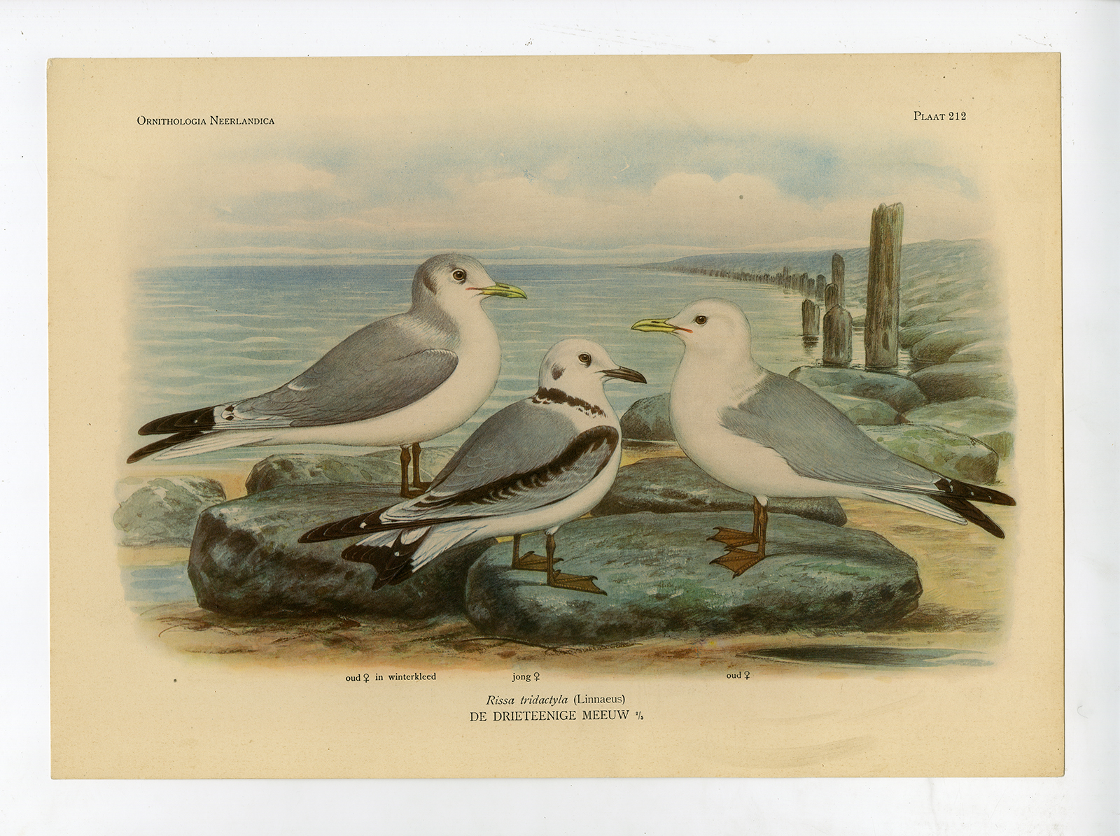 Onderwerp: Antieke prent, getiteld: ‘Pl. 212. Ornithologica Neerlandica. Rissa tridactyla – De Drieteenige Meeuw’ – Dit bord toont de drieteenmeeuw (Rissa tridactyla).